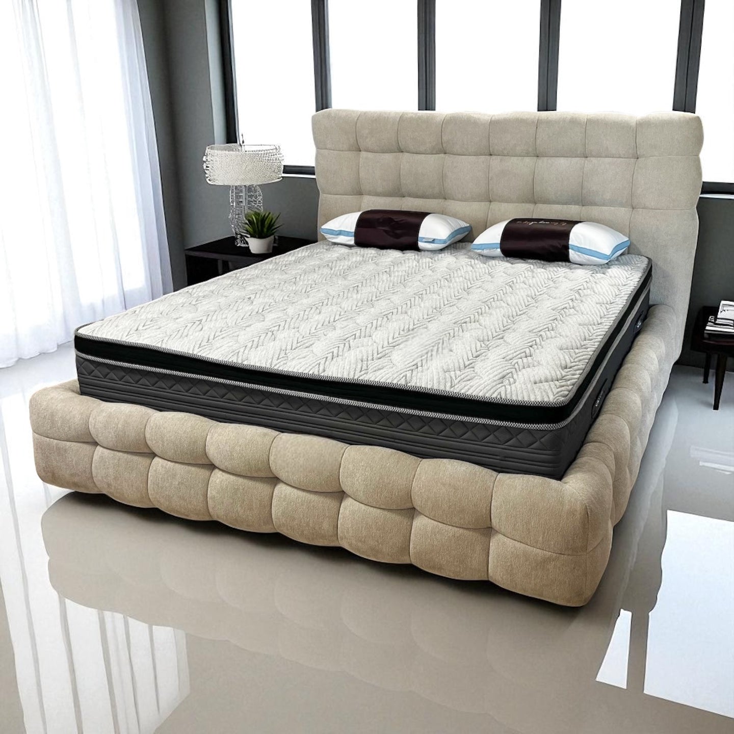Με το χαρακτηριστικό καπιτονέ φινίρισμα σε κεφαλάρι και βάση, προσφέρει μια αίσθηση πολυτέλειας και ζεστασιάς, μετατρέποντας το υπνοδωμάτιο σε έναν χώρο χαλάρωσης και κομψότητας.