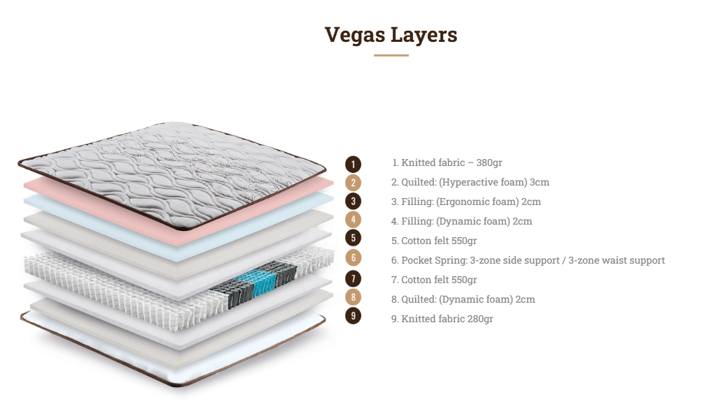 Το ανατομικό στρώμα Vegas, με το άνετο επάνω στρώμα Eurotop, είναι εδώ για να μετατρέψει τον ύπνο σου σε μια χαλαρωτική εμπειρία.